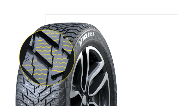 Элементы рисунка вокруг шипов противоскольжения создают эффект щетки, очищая поверхность льда или укатанного снега для повышения эффективности работы шипов в режиме разгона и торможения